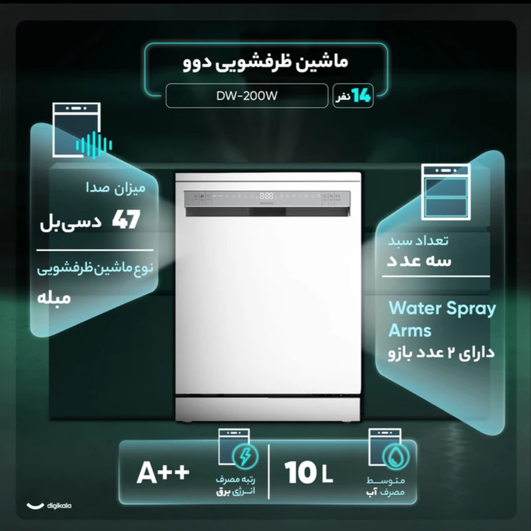 درمجموع، DW-200W یک ماشین ظرفشویی قدرتمند و مدرن و درعینحال که امکانات متنوع، عملکرد کممصرف و طراحی کاربرپسند دارد بسیار حامی محیطزیست هم است و برای نیازهای خانوادههای پرجمعیت گزینهای مناسب محسوب میشود. انعطافپذیری بالا در چیدمان ظروف و برنامههای شستوشوی متنوع از دیگر ویژگیهایی است که آن را به گزینهای مناسب برای کسانی تبدیل کرده که به دنبال ترکیبی از کارایی، ایمنی و صرفهجویی در مصرف منابع هستند.